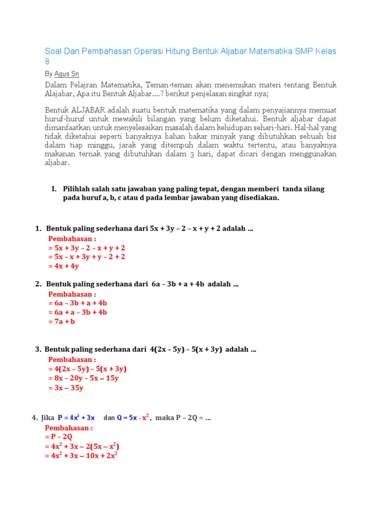 Selesaikan bentuk aljabar berikut ini. Cobalah untuk rutin mengerjakan latihan soal agar kalian semakin terbiasa dengan rumusnya. Soal dan pembahasan operasi hitung bentuk aljabar matematika smp kelas 8 pembaca yang budiman jika anda merasa bahwa artikel di agus blog ini bermanfaat silakan berbagi di media sosial lewat tombol share di bawah ini.